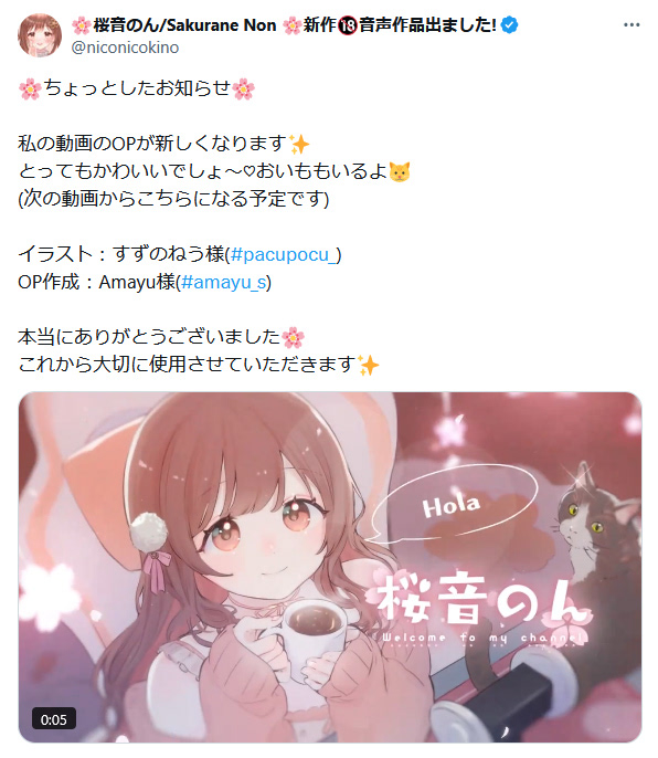 桜音のんさんのYouTube動画用のオープニング映像を制作いたしました。