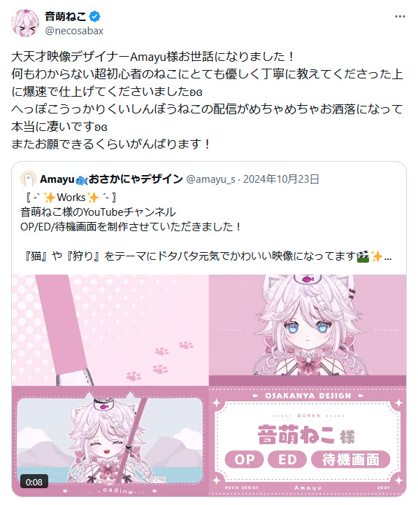 音萌ねこさんの配信用のオープニング映像、エンディング映像、待機画面映像の3つを制作いたしました。